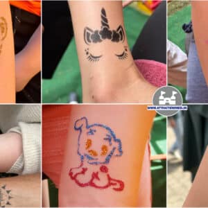 Naast schminken bieden we ook de mogelijkheid om glittertattoos toe te voegen aan het feest. Deze sprankelende en kleurrijke tattoos zijn een enorme hit bij kinderen en volwassenen en voegen een extra dosis plezier toe aan je evenement. Een stoerdere tattoo kunnen we plaatsen door middel van airbrush.